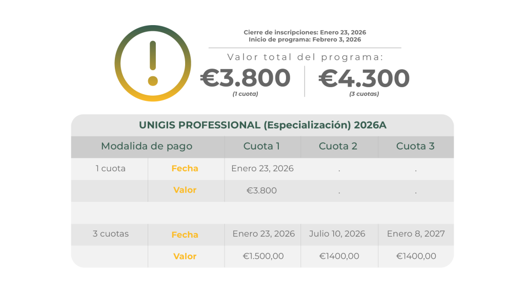 La Especialización en SIG está dirigida a profesionales con título de pregrado (tercer nivel), cuenta con una duración de 14 meses con una dedicación semanal de 12-15 horas en promedio. UNIGIS brinda al estudiante los recursos necesarios en línea para garantizar su excelente desempeño. La estructura modular del programa está conformada por 7 módulos básicos, complementados con 3 módulos electivos. La tesis o desarrollo de trabajo de investigación no son requeridos.