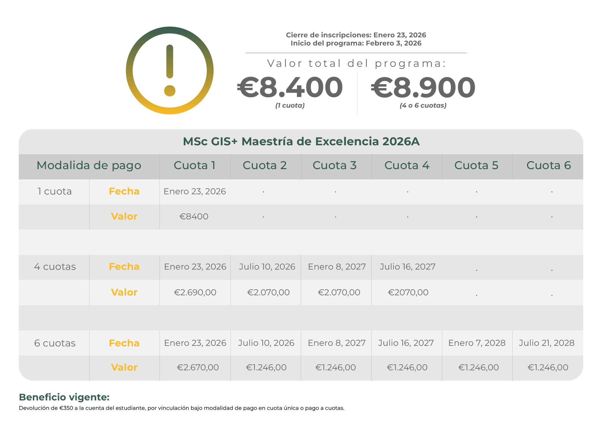 La Maestría de Excelencia MSc+ es un programa de alto nivel dirigido a profesionales de diferentes disciplinas, con título de pregrado (tercer nivel), interesados en fortalecer un alto perfil gerencial y su experticia en la Ciencia SIG. Periódicamente el programa de postgrado recibe a postulantes vinculados al sector público o privado, investigadores y empresarios relacionados con el campo SIG.